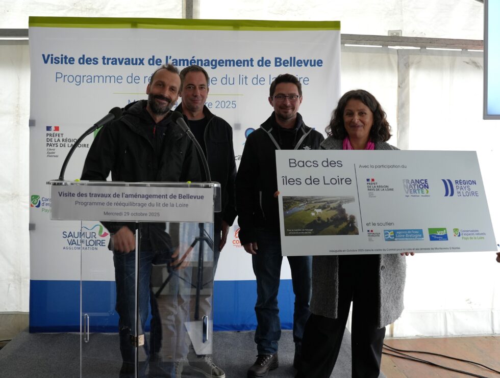 A terre, trois autres éleveurs, administrateurs de l’association, Brice CHERET, Damien EPOUDRY et Maxime LERAT, ont présenté les avancés de leur projet, en moins de deux ans : Un vrai défi relevé pour la préservation et la sécurisation de l’élevage extensif sur les îles, la préservation des paysages, de la biodiversité et la dynamique du fleuve. A leur côté, Alain LAPLACE, président du CEN Pays de la Loire a exprimé son plaisir de les accompagner avec VNF, dans cette belle aventure.